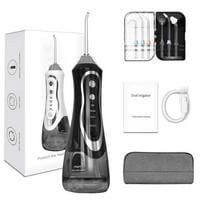 Compact, IPX7 waterproof oral irrigator with a 300 ml water tank and built-in intelligent chip for 2-minute automatic timing and last-mode memory. Offers 45–130 PSI adjustable high-pressure flushing for effective yet gentle cleaning. Comes with 7 color-coded nozzles, lithium battery for long-lasting portable use, and optional accessories such as a nozzle box or storage bag.